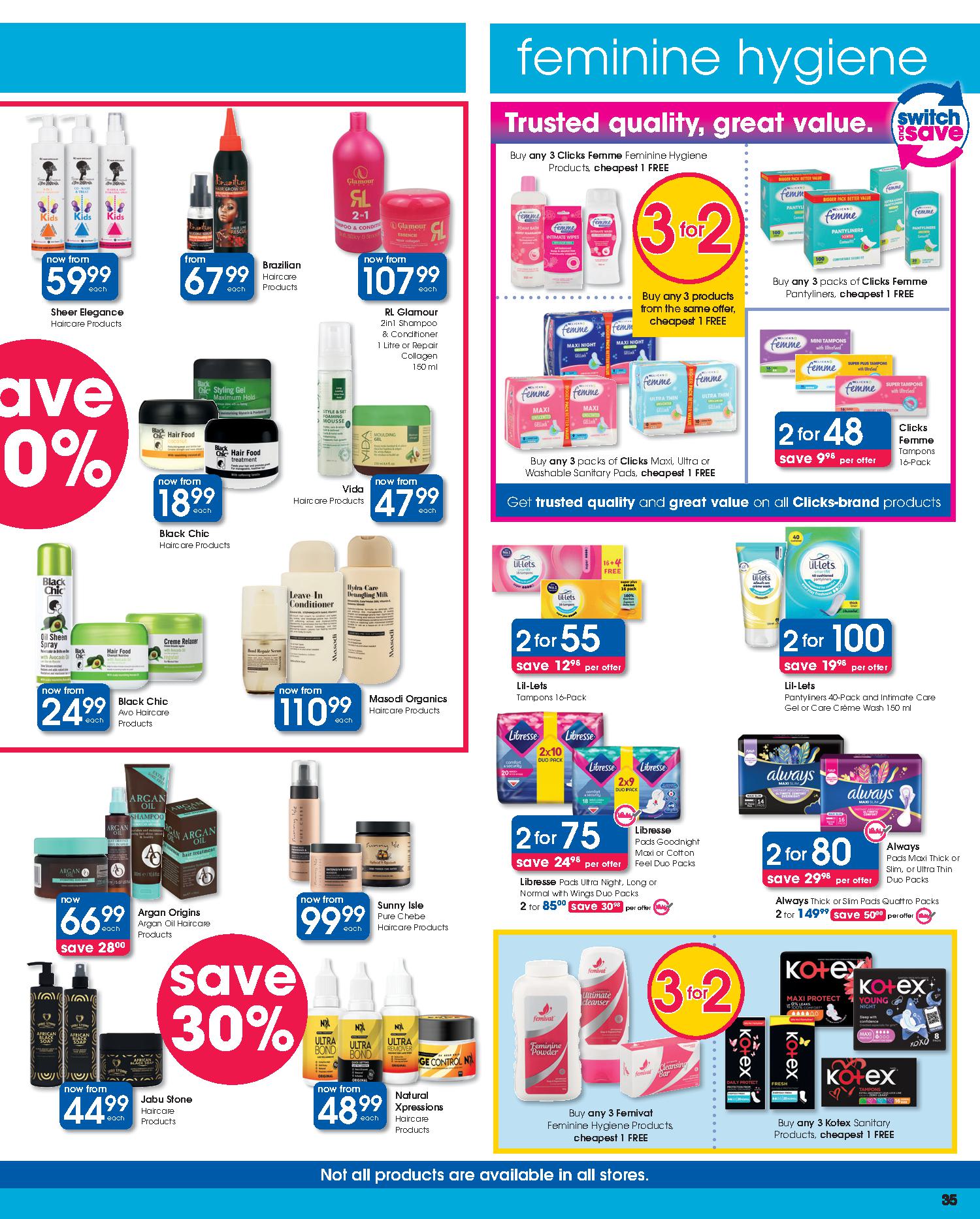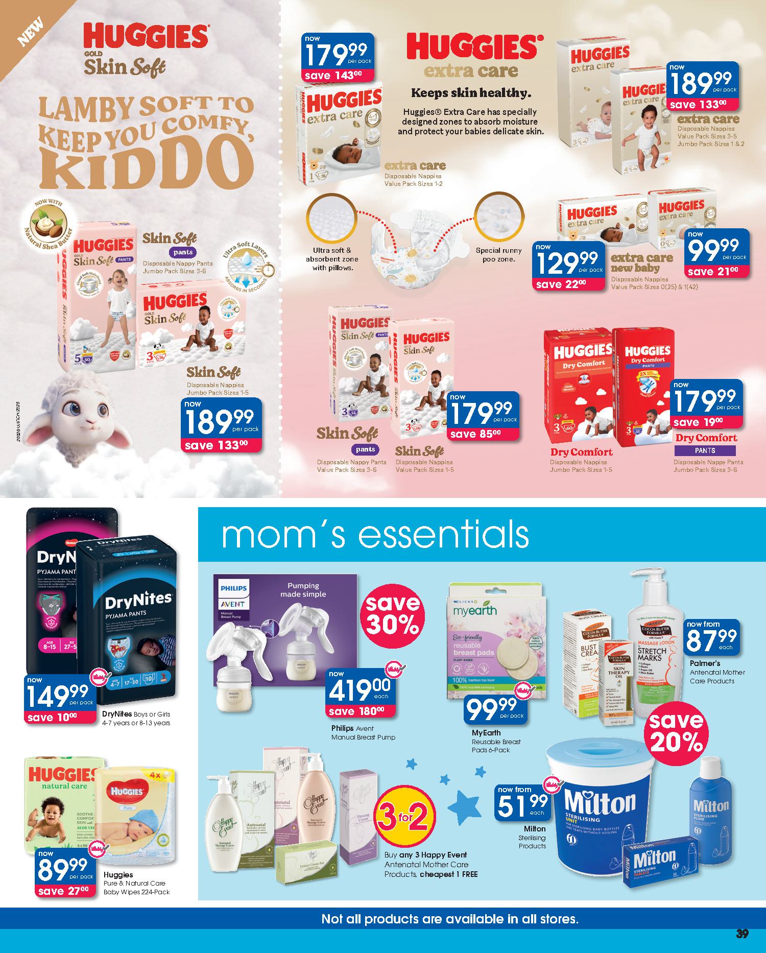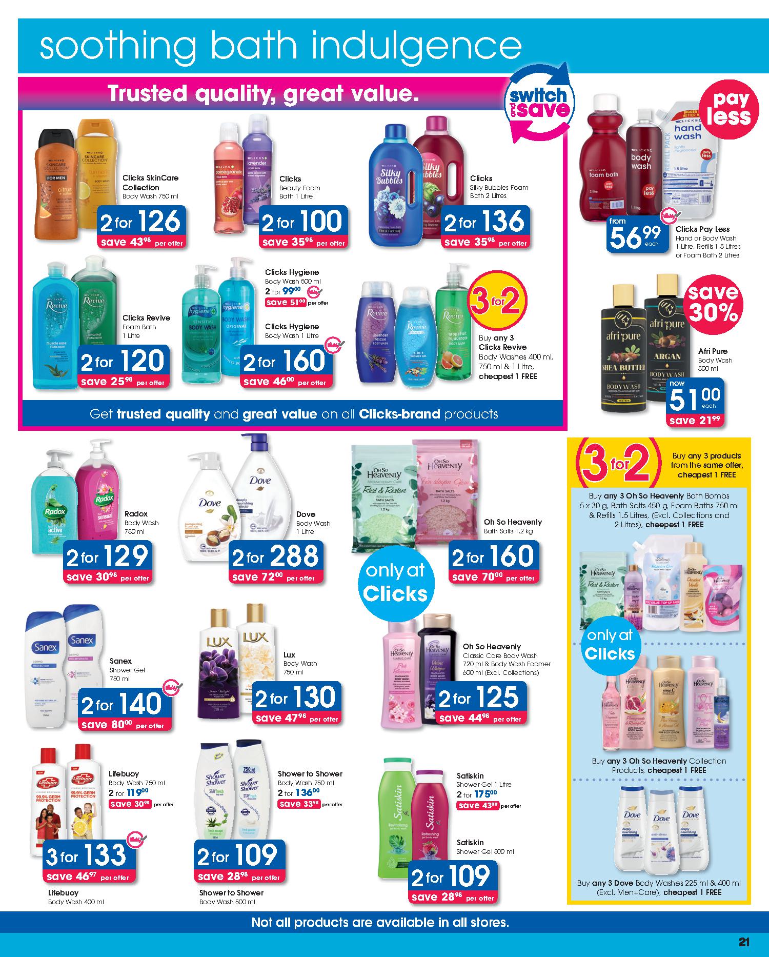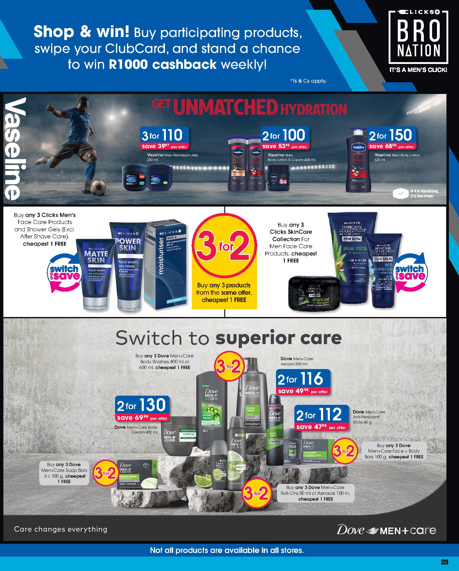 Get savings on: Lindt Lindor Truffles 125g, Pampers Active Baby Disposable Nappies Jumbo Pack, Clicks Deep Clean Toothbrush, Dawn Body Lotion or Cream, Omo Auto Washing Powder 2kg, Disney Baby Textile Products, Playgro Baby Toys, Coty Men’s Deodorant Spray 120ml, Wahl Colour Coded Combo, Philips DualCut Precision Trimmer, and many more.