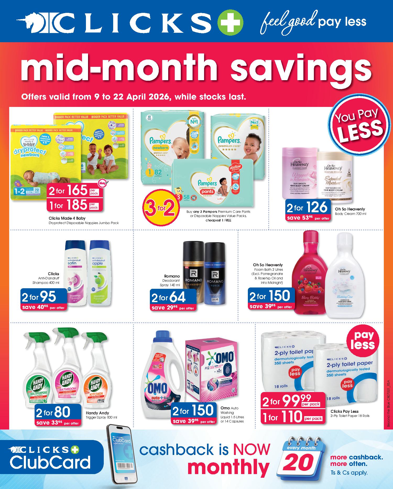View this week Clicks Specials, valid 9 April – 22 April, 2026. Save with the latest Clicks specials, weekly catalogue, deals, sales and offers.