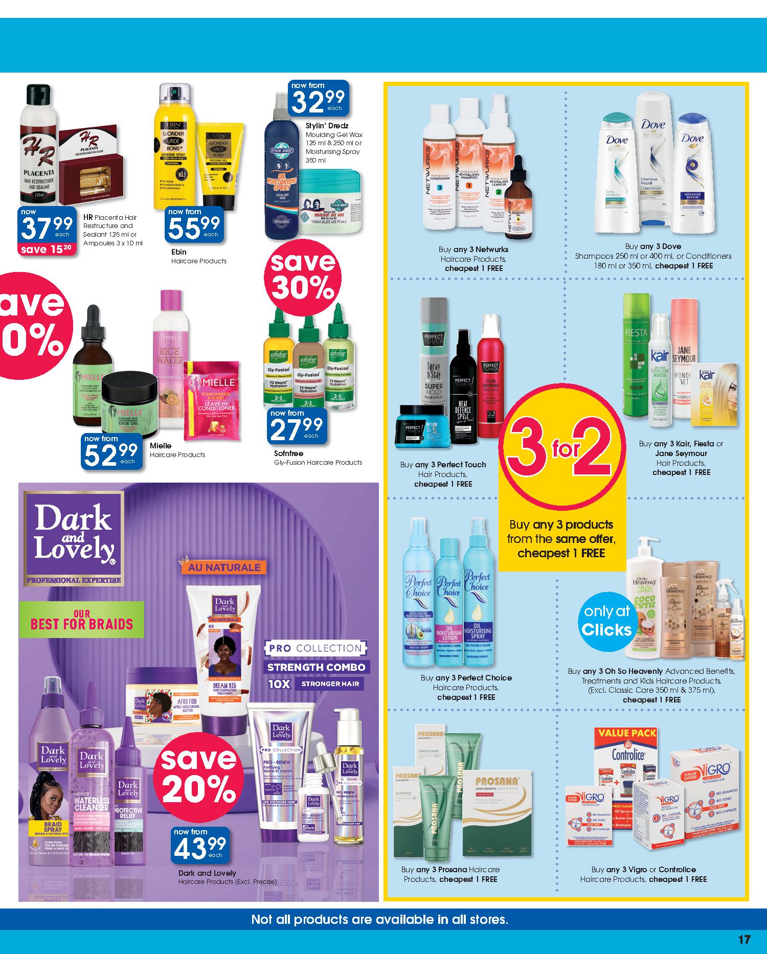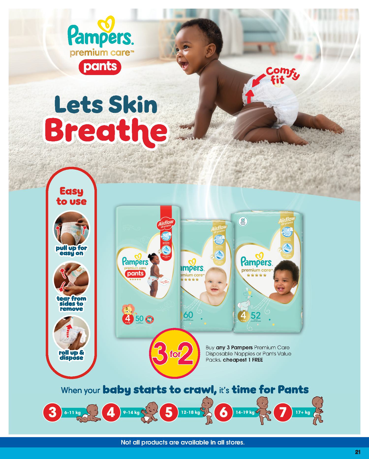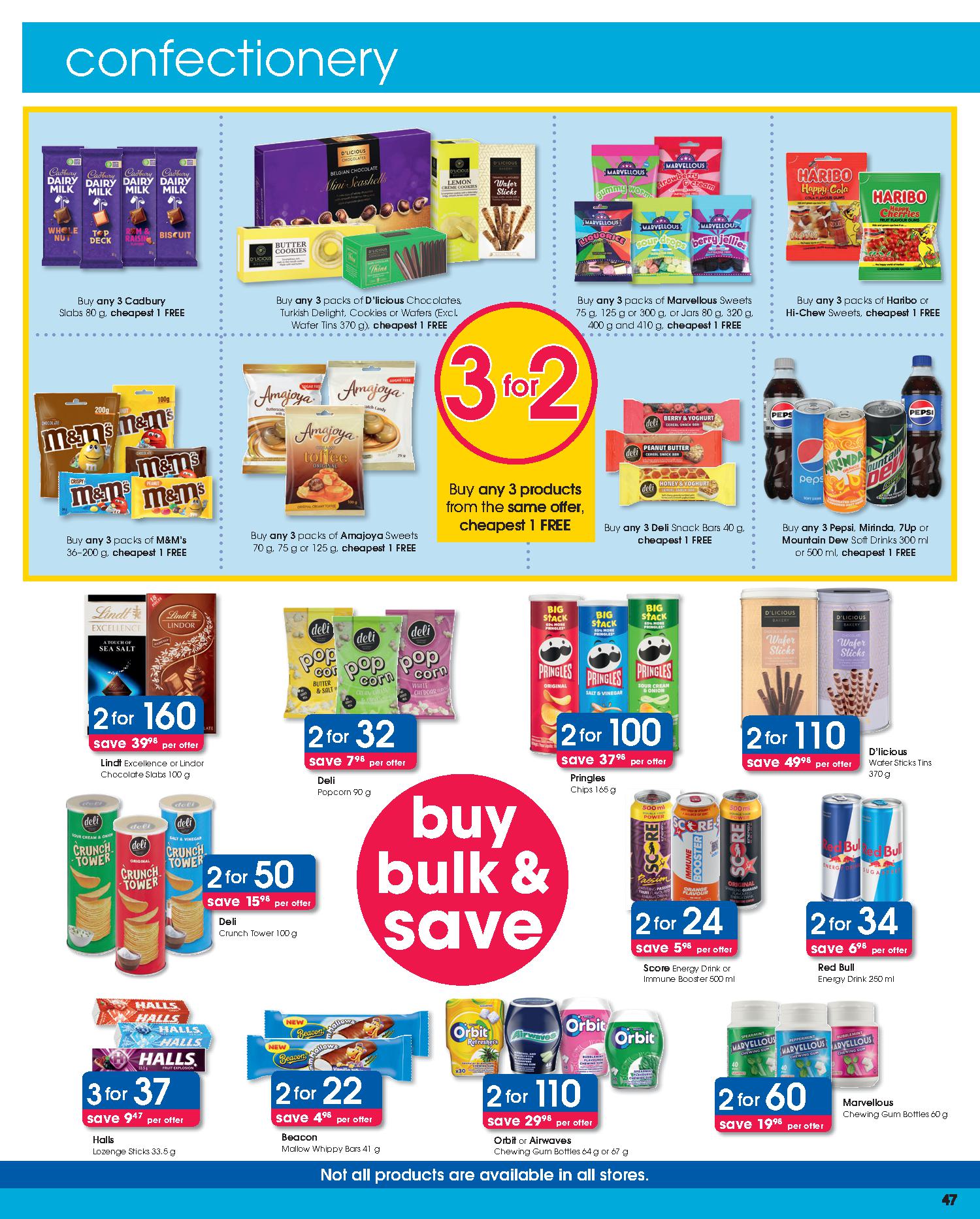 Get savings on: Lindt Lindor Truffles 125g, Pampers Active Baby Disposable Nappies Jumbo Pack, Clicks Deep Clean Toothbrush, Dawn Body Lotion or Cream, Omo Auto Washing Powder 2kg, Disney Baby Textile Products, Playgro Baby Toys, Coty Men’s Deodorant Spray 120ml, Wahl Colour Coded Combo, Philips DualCut Precision Trimmer, and many more.