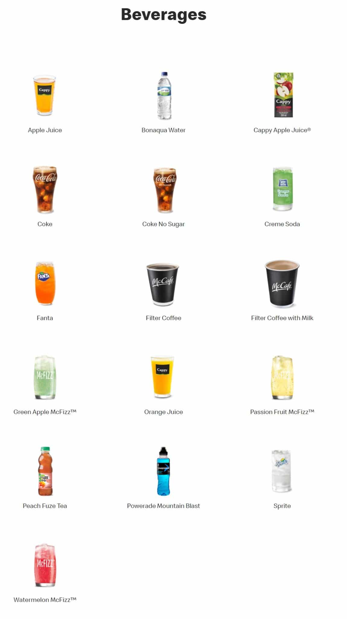 You can choose from delicious burgers like the Big Mac and Big Mac Meal, Quarter pounder with cheese burger, McFeast burger, McRoyale burger or Meal, Cheeseburger, Grand Chicken burger, McChicken burger or Meal, and the Filet-O-Fish burger.