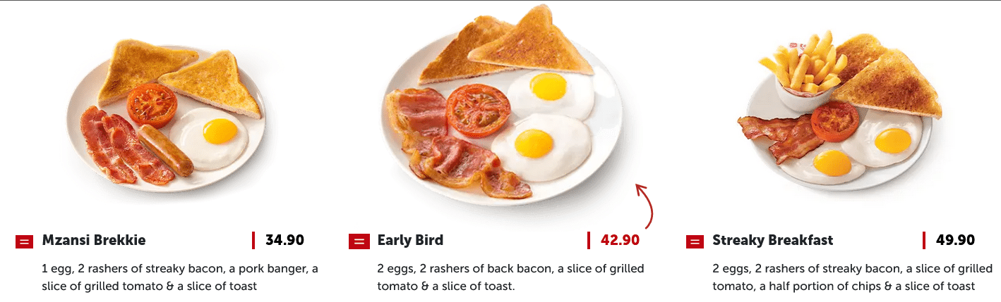 – Streaky Breakfast for R49.90 – get 2 eggs, 2 rashers of streaky bacon, a slice of grilled tomato, a half portion of chips & a slice of toast