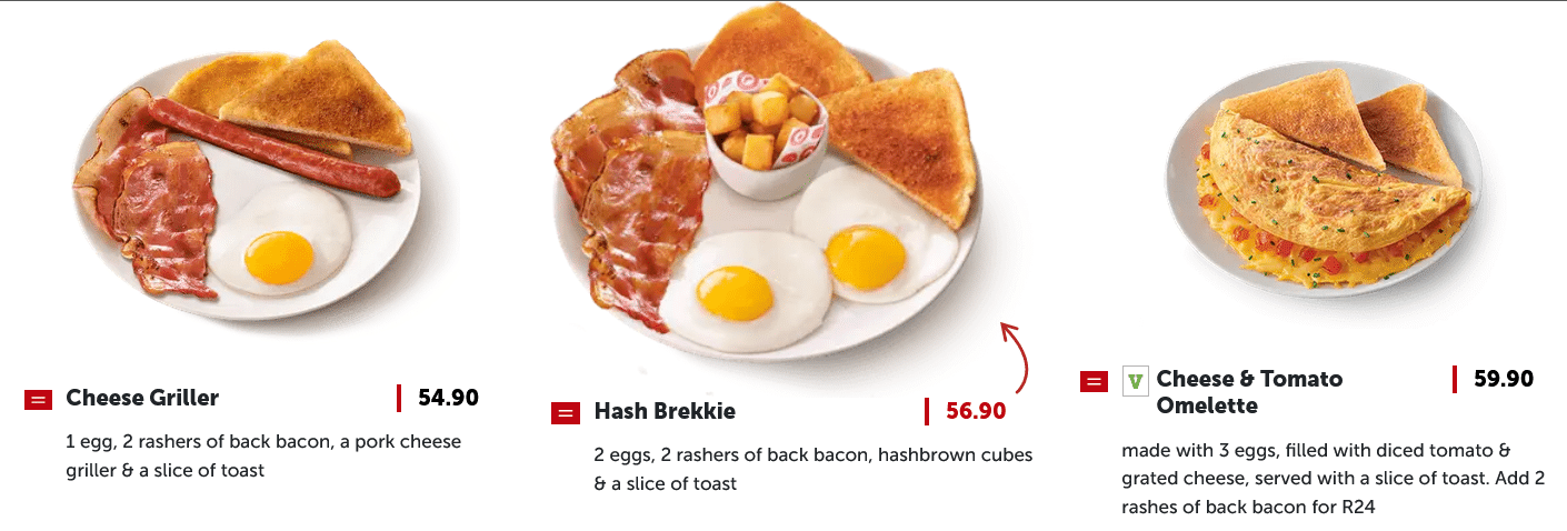 – Cheese Griller Breakfast for R54.90 – get 1 egg, 2 rashers of bacon, a pork cheese griller & a slice of toast
